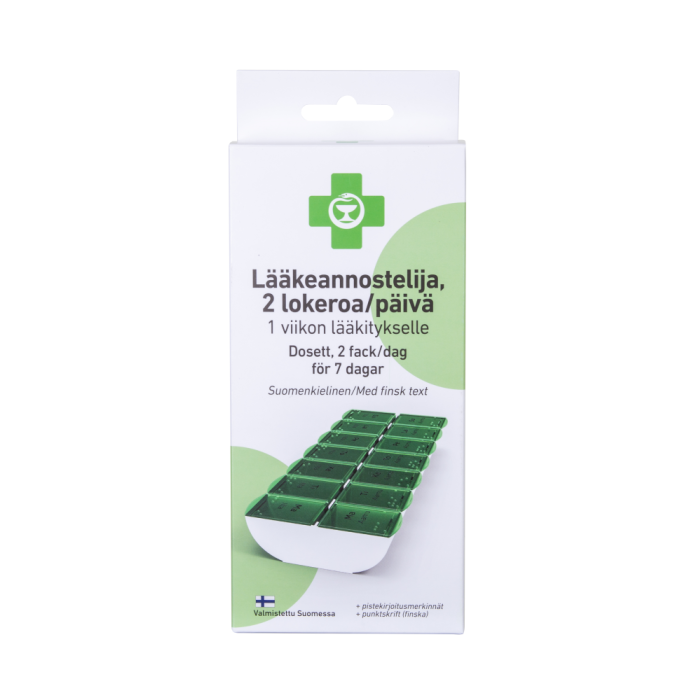 APTEEKKI Lääkeannostelijassa on 2 lokeroa/päivä aamu- ja iltalääkkeiden erittelyn helpottamiseksi. Suunniteltu viikon lääkemäärälle. Valmistettu Suomessa.